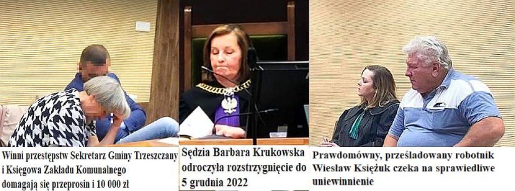 Skuleni i chichoczący urzędnicy gminy Trzeszczany wsłuchiwali się wczoraj w Sądzie Okręgowym w Zamościu w odtwarzane z magnetofonu swoje przekleństwa i namawianie Wiesława Księżuka do popełniania przestępstw przeciw prokuraturze. Dlaczego sędzia Barbara Krukowska nie zakończyła wczoraj procesu, w którym domagają się od robotnika 10 000 zł zadośćuczynienia za „naruszenie dóbr osobistych” i przeprosin, tylko odroczyła sprawiedliwość aż do 5 grudnia 2022?